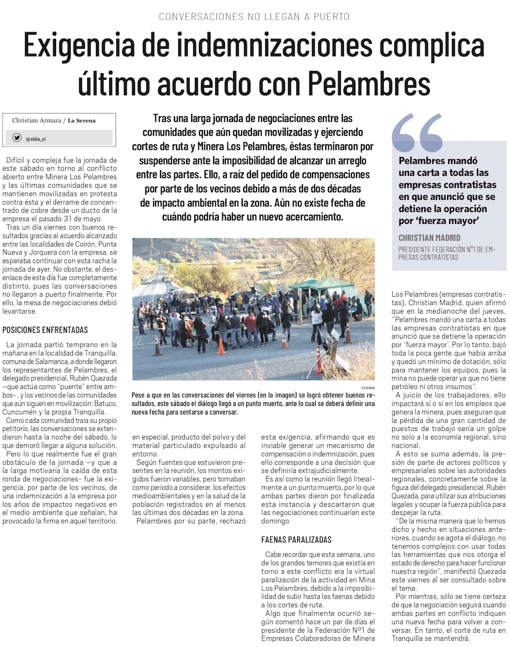 Conflicto en Los Pelambres: Minera llega a acuerdo con tres comunidades - (El Día)