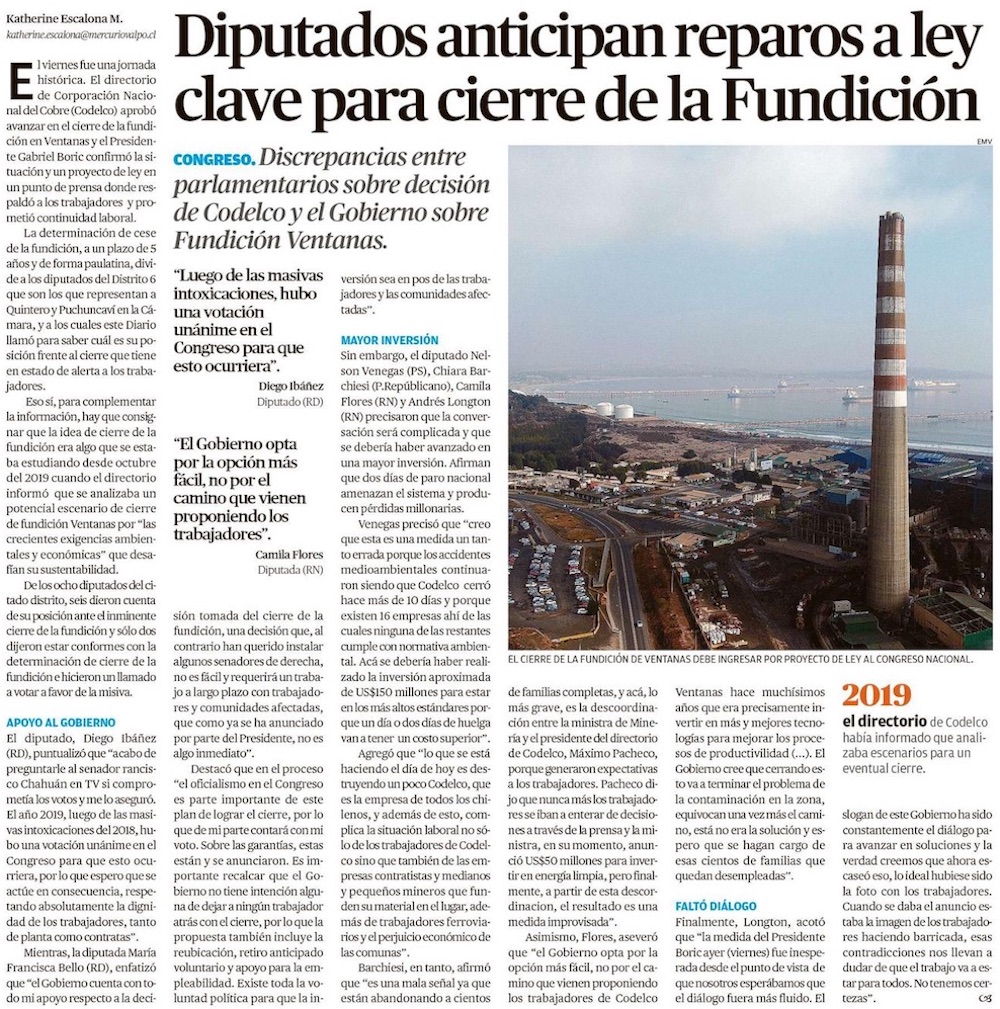 Cierre de Ventanas enciende debate legislativo sobre dónde se fundirá el cobre de Codelco - (Diario Financiero)