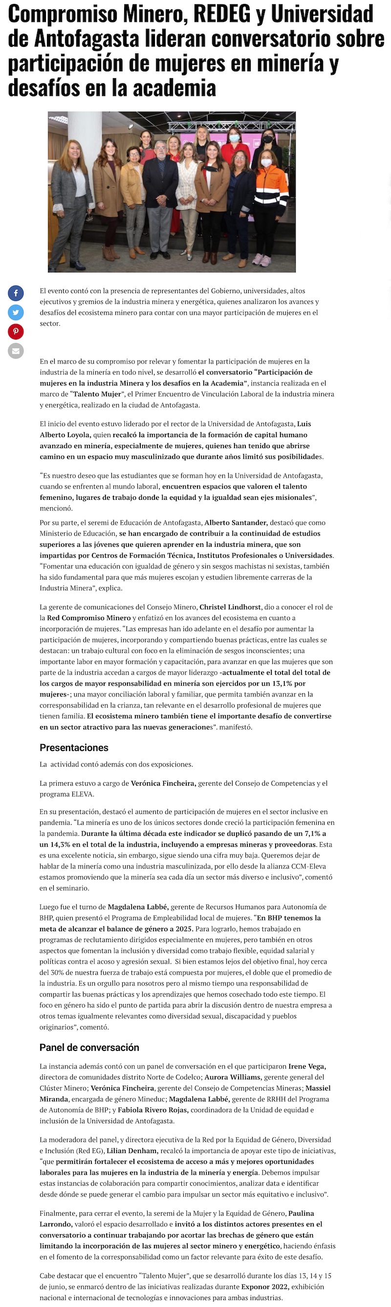 Compromiso Minero, REDEG y Universidad de Antofagasta lideran conversatorio sobre participación de mujeres en minería y desafíos en la academia - (mch.cl)