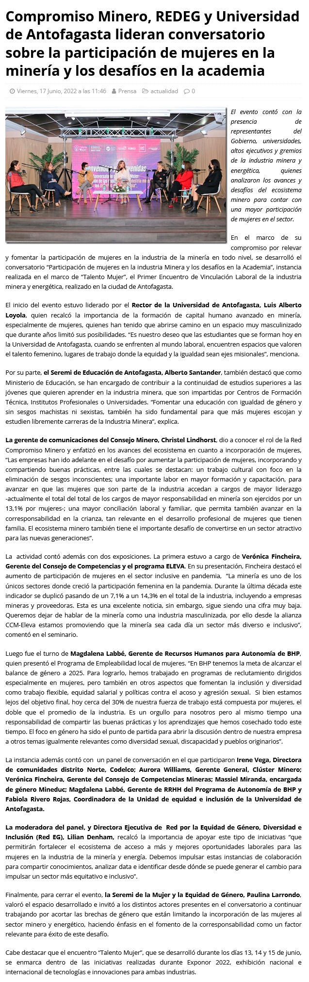 Compromiso Minero, REDEG y Universidad de Antofagasta lideran conversatorio sobre participación de mujeres en minería y desafíos en la academia - (mch.cl)