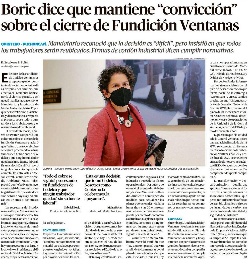 Maisa Rojas: Decisión de cerrar fundición en Ventanas es de Codelco, y Gobierno la apoya - (El Mercurio de Santiago)
