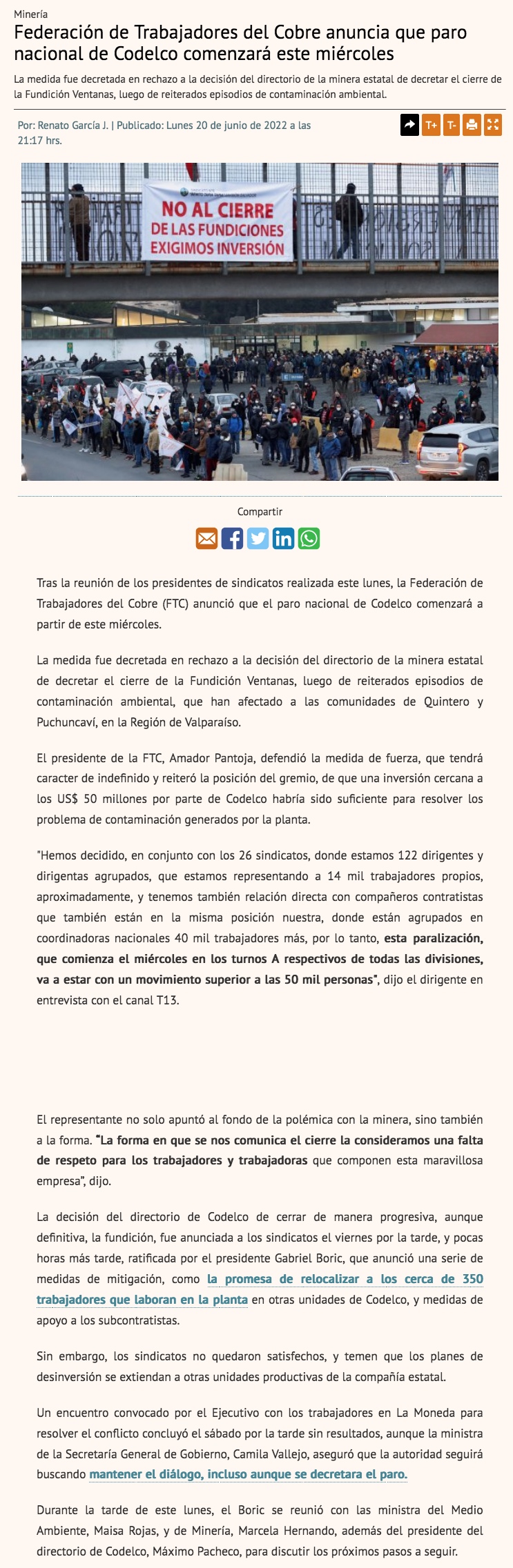Trabajadores de Codelco dicen que el paro nacional va "sí o sí" y el gobierno pide cronograma de cierre de Ventanas - (Pulso)