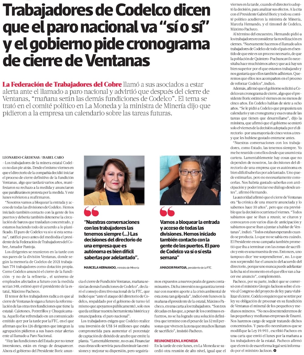 Trabajadores de Codelco aseguran que iniciarán paralización a partir de mañana - (El Mercurio de Santiago)