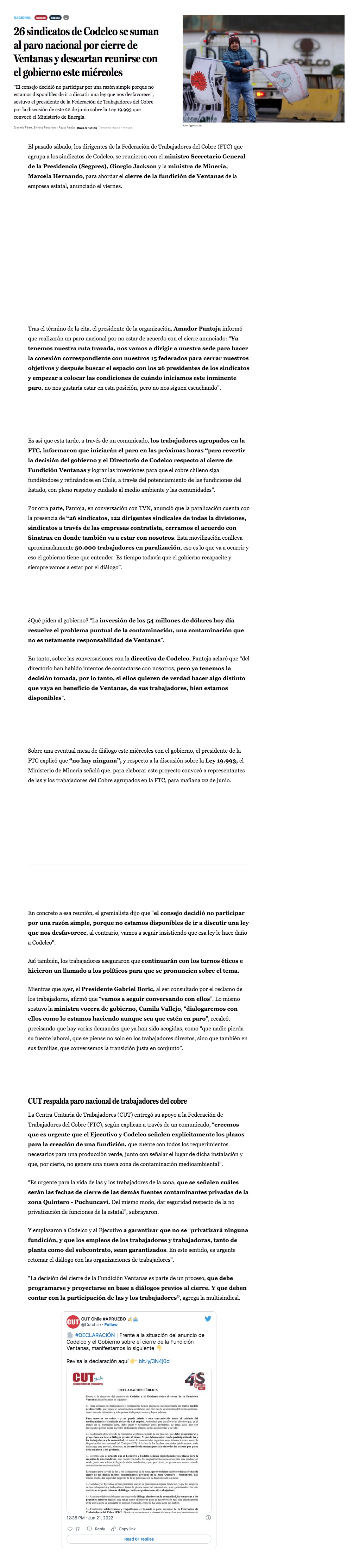 Paro de Codelco por cierre de Ventanas que se inicia este miércoles incluiría a todas las divisiones y suma a 26 sindicatos - (Pulso)