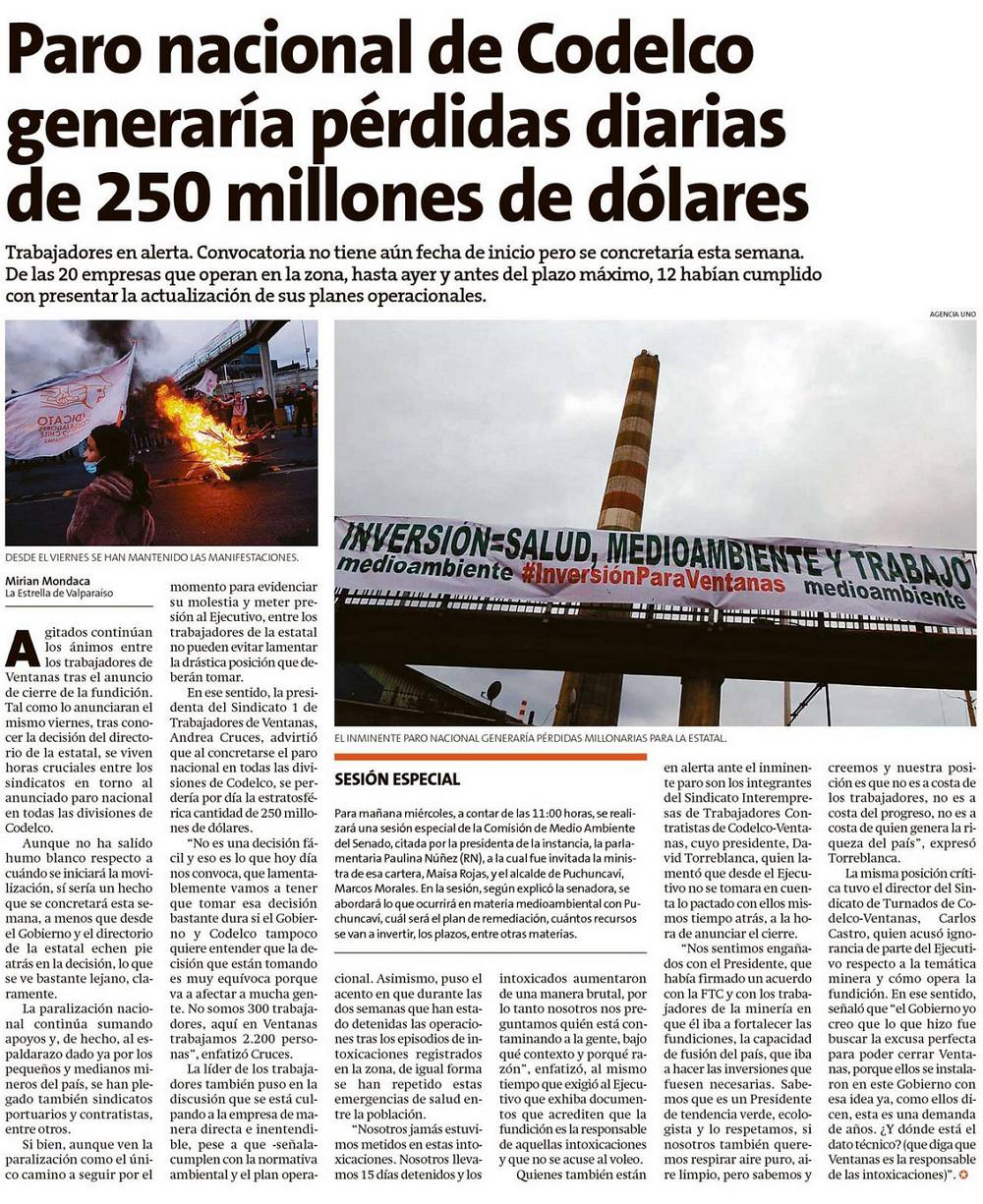 Paro de Codelco por cierre de fundición Ventanas podría costar hasta US$ 30 millones diarios - (El Mercurio de Santiago)