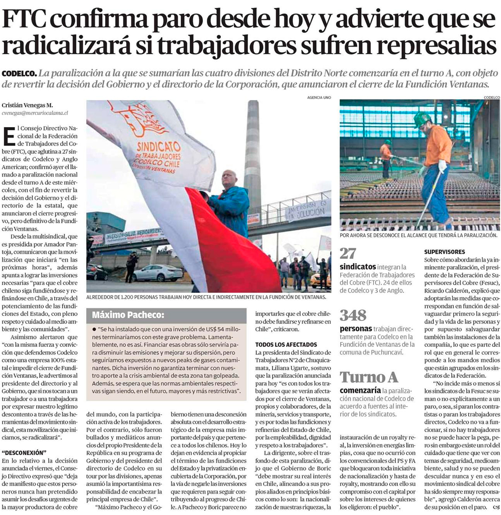 26 sindicatos de Codelco se suman al paro nacional por cierre de Ventanas y descartan reunirse con el gobierno este miércoles - (La Tercera Online)