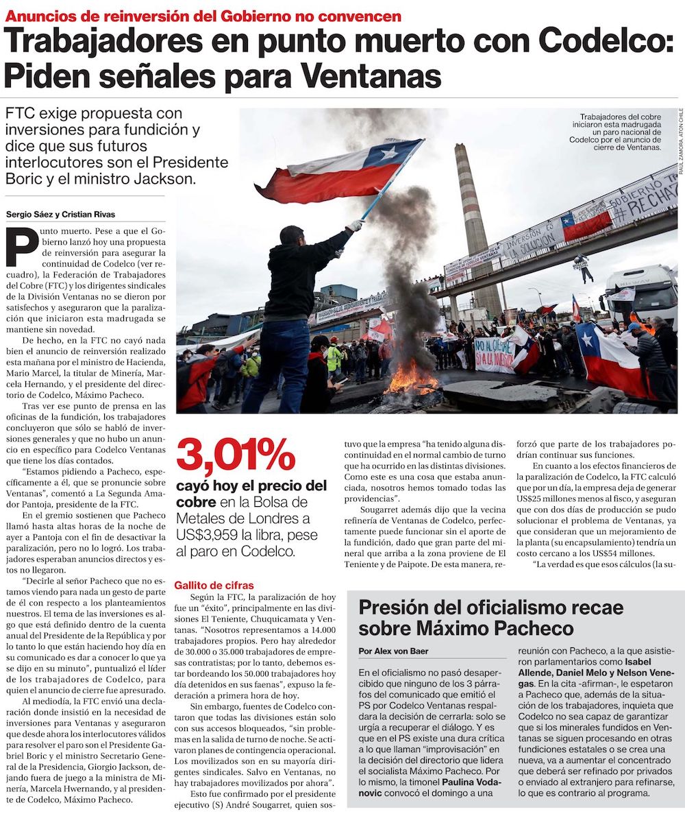 Crece tensión en primer día de paro de Codelco por cierre de Ventanas y se aleja opción de acuerdo - (Diario Financiero)
