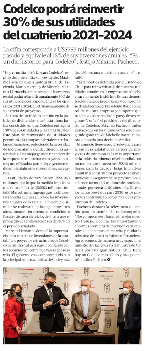 Pacheco anuncia histórico plan de reinversión de la estatal - (El Mercurio de Calama)