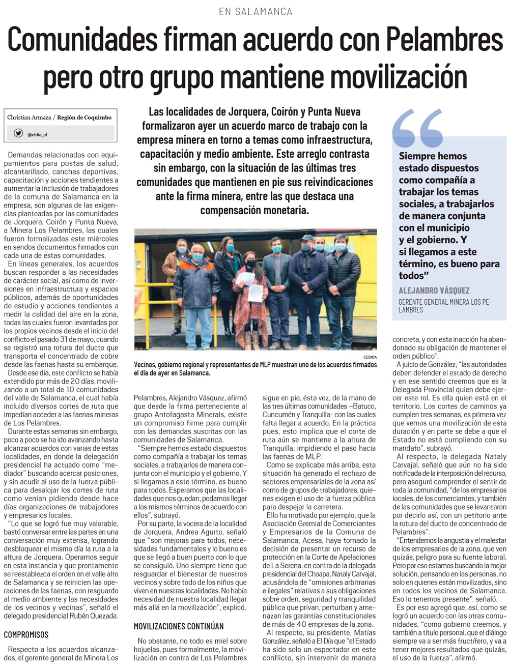 Los Pelambres alcanza acuerdo con comunidad que mantenía bloqueo - (El Mercurio de Santiago)
