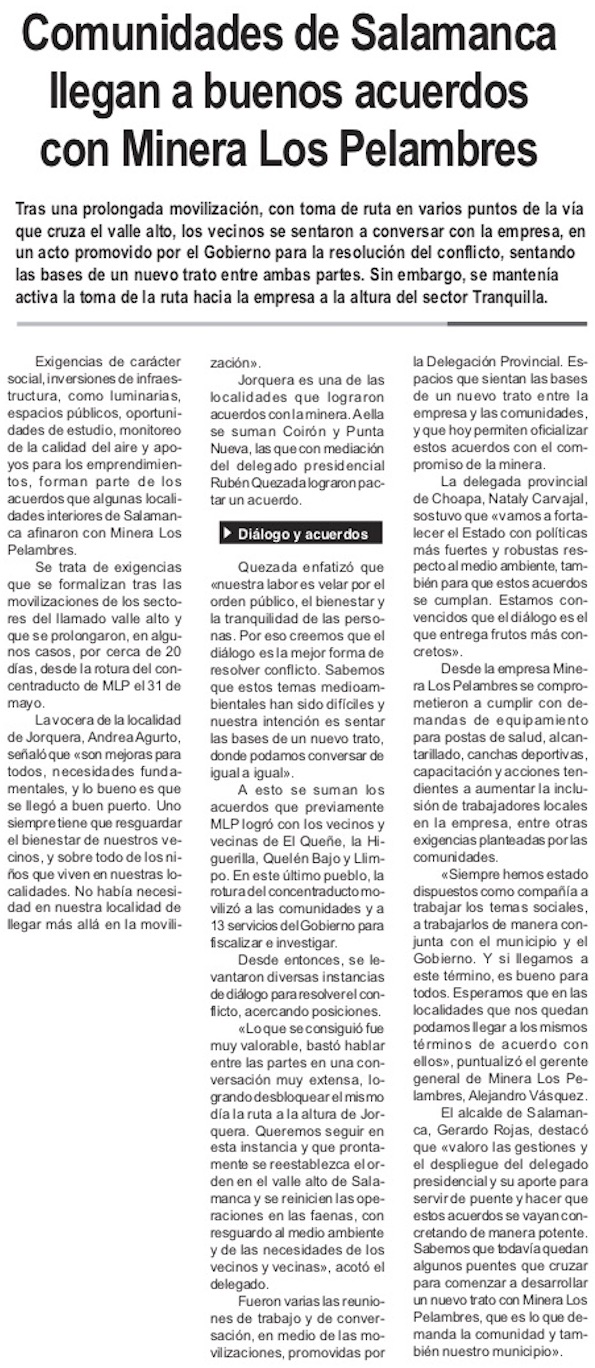 Los Pelambres alcanza acuerdo con comunidad que mantenía bloqueo - (El Mercurio de Santiago)