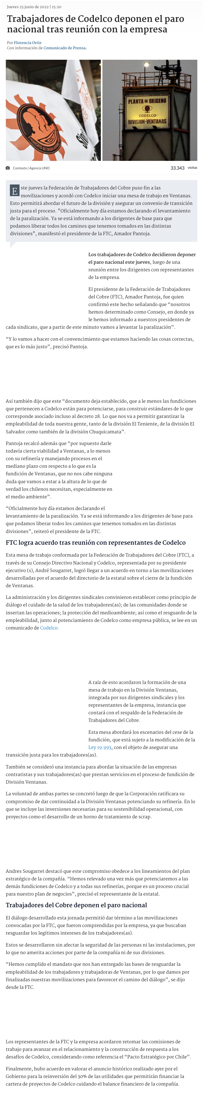 Codelco logra acuerdo con sindicatos, y deponen huelga tras anuncio de cierre de Ventanas - (El Mercurio de Santiago)