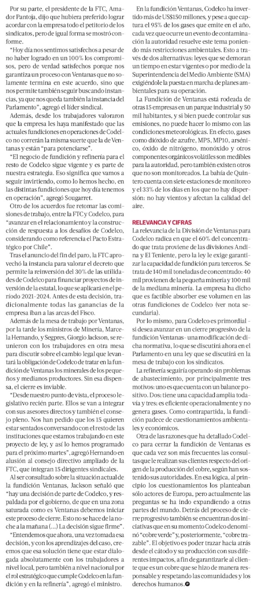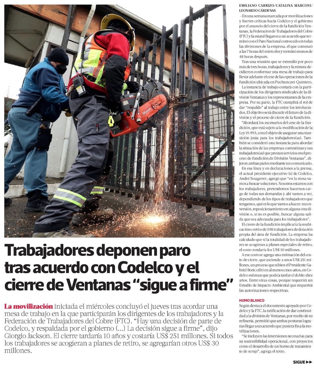 Codelco logra acuerdo con sindicatos, y deponen huelga tras anuncio de cierre de Ventanas - (El Mercurio de Santiago)