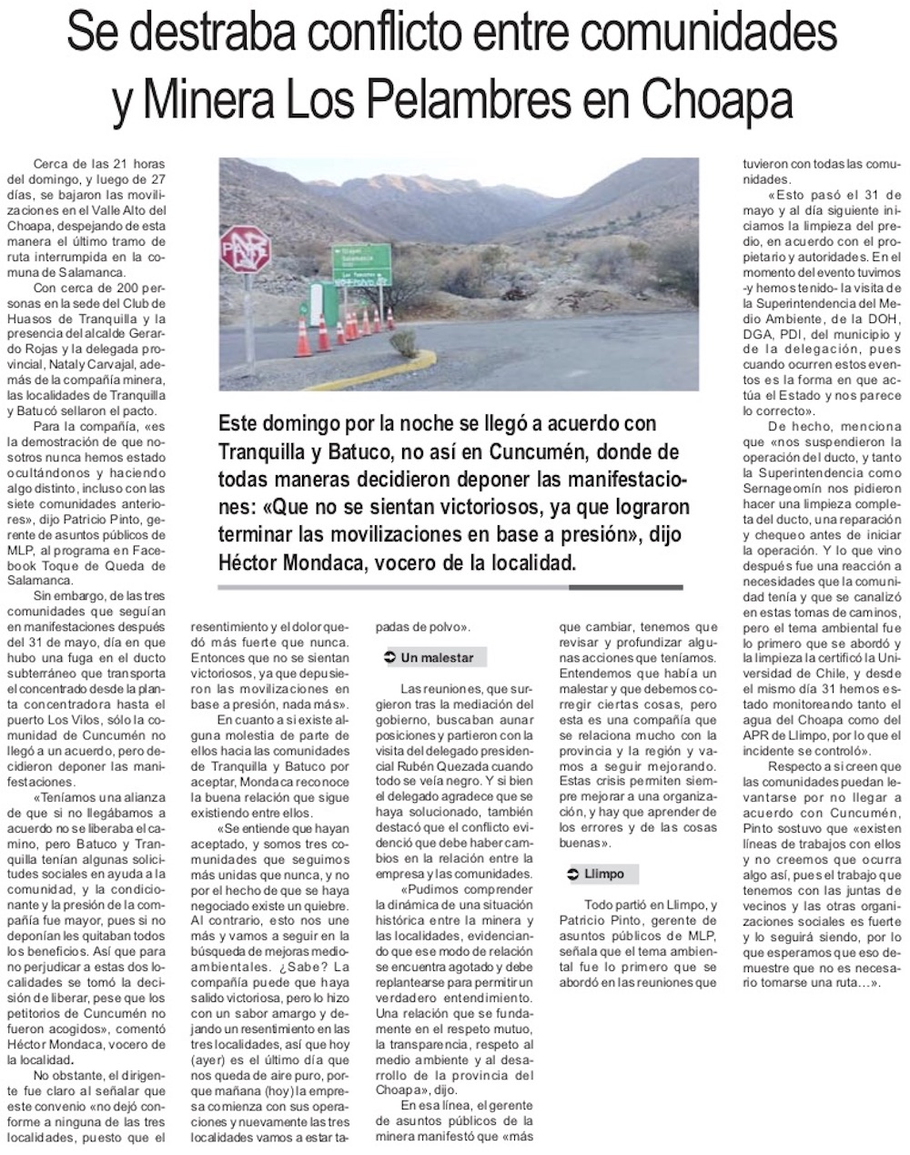 Acuerdo entre comunidades y minera Los Pelambres termina con despeje de ruta - (El Día)
