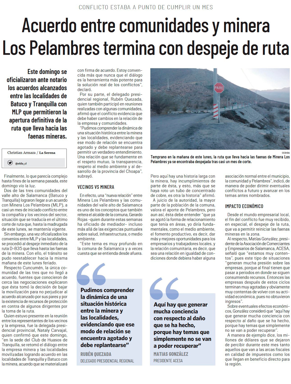 Se destraba conflicto entre comunidades y Minera Los Pelambres en Choapa - (La Región)