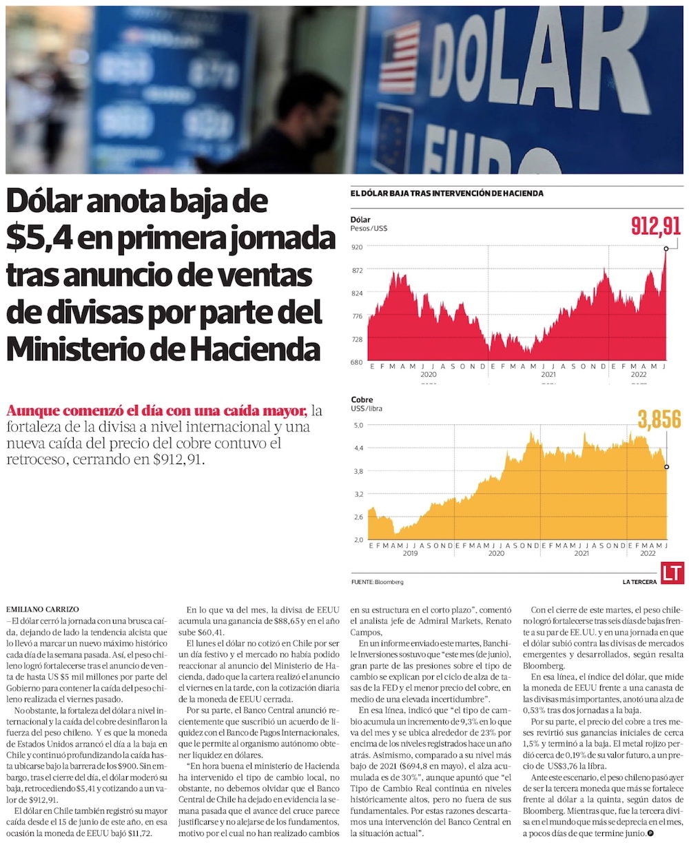 Efecto de subasta de Hacienda en mercado cambiario se diluye y dólar cierra en $911 - (El Mercurio de Santiago)