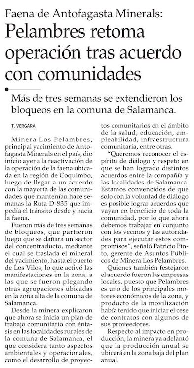Minera de Luksic anuncia fin de bloqueo en acceso a Los Pelambres tras acuerdos con las comunidades - (Diario Financiero)