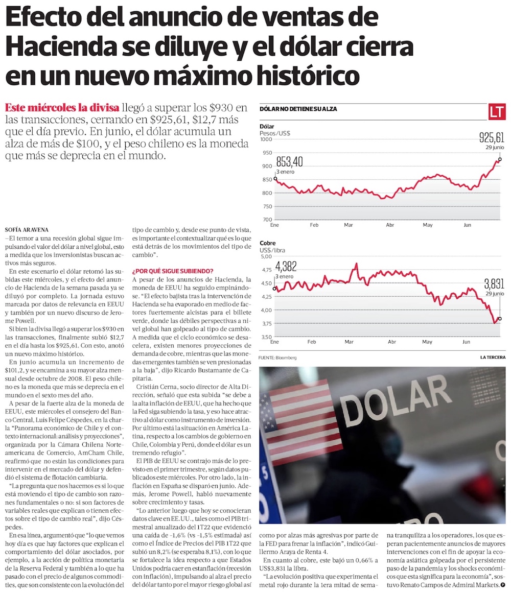 Dólar se dispara a $924,7, cierra en nuevo récord y suma alza de más de $100 en junio - (El Mercurio de Santiago)