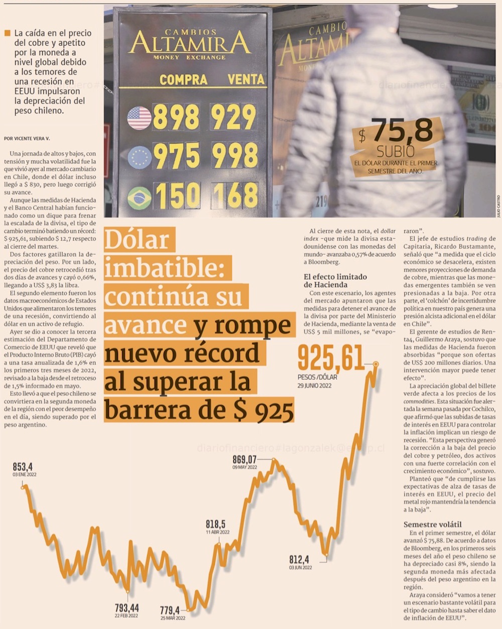 Dólar se dispara a $924,7, cierra en nuevo récord y suma alza de más de $100 en junio - (El Mercurio de Santiago)