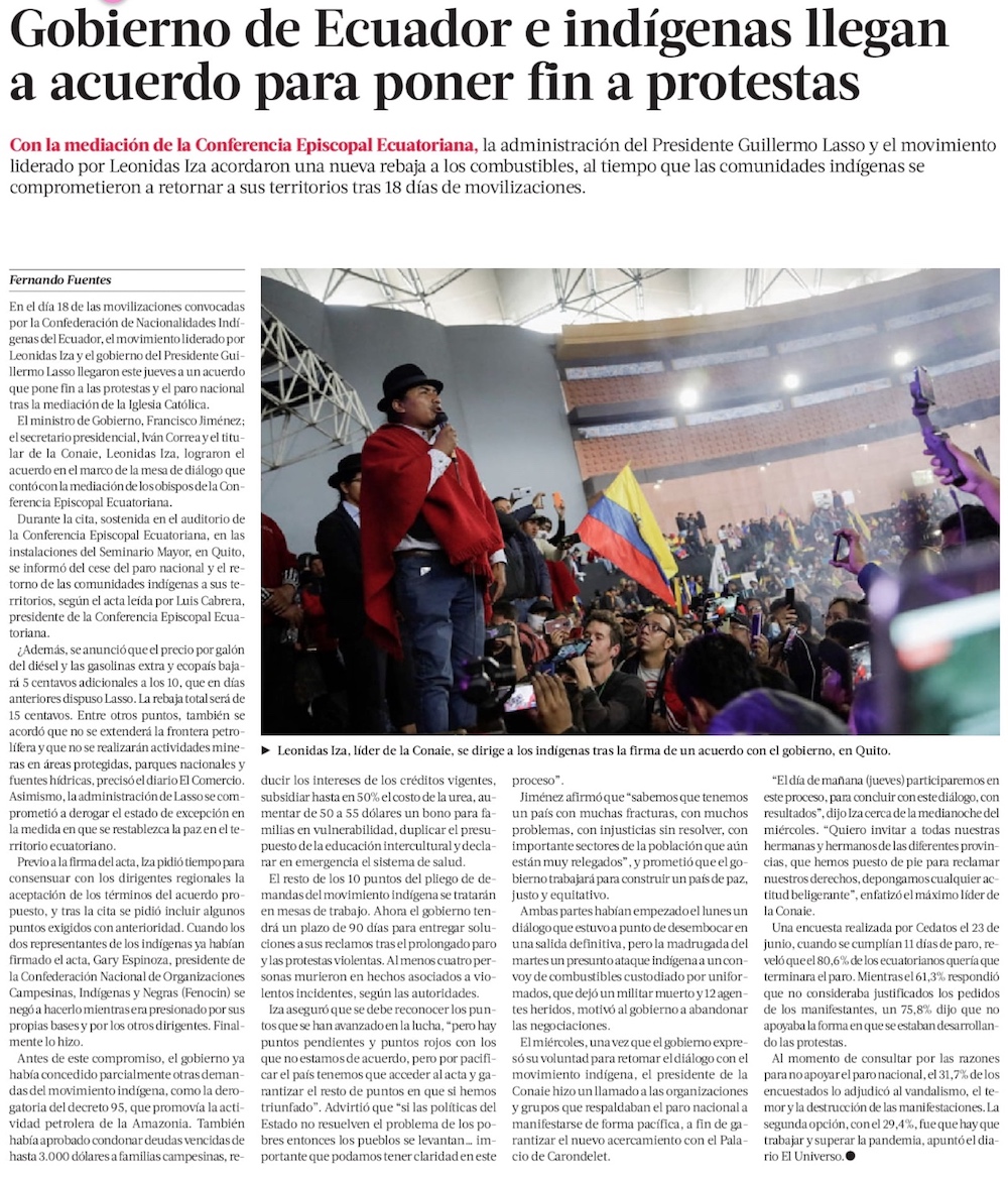 Gobierno y grupos indígenas en Ecuador logran acuerdo, y terminan movilizaciones - (Diario Financiero)