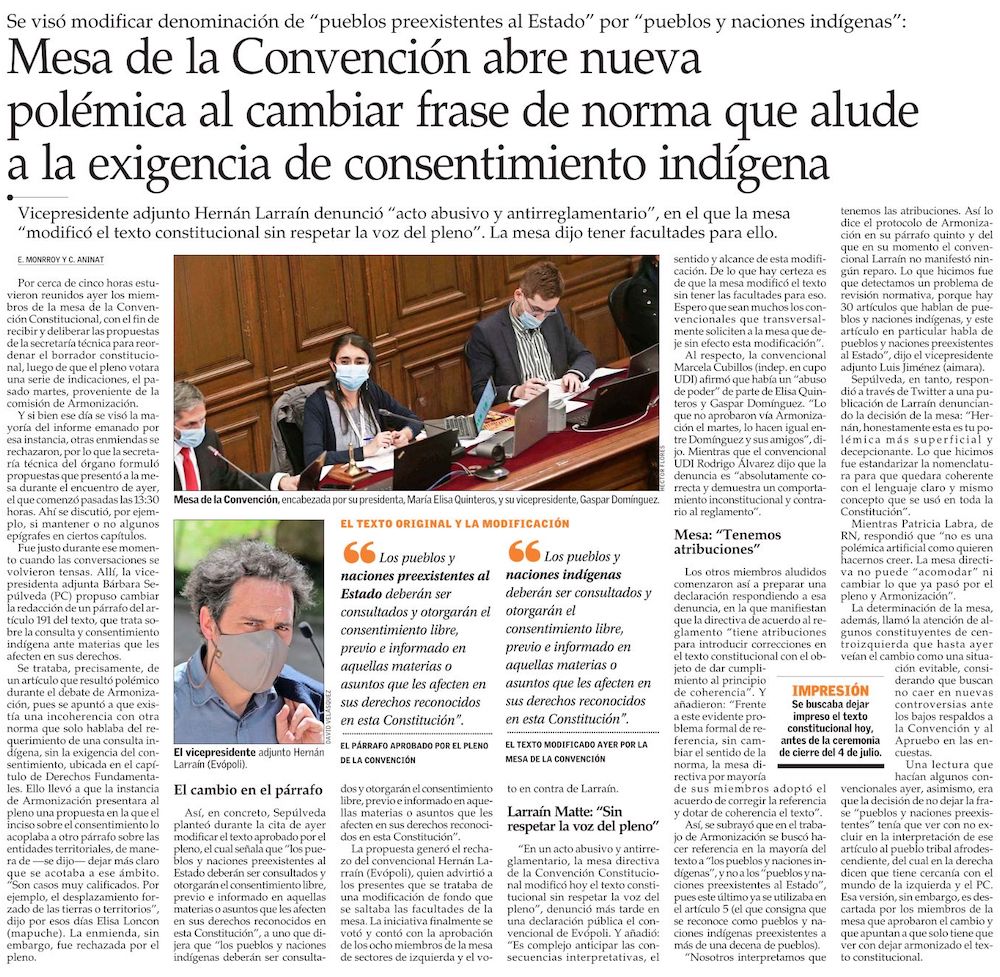 Al cierre de la Convención, se acentúa discusión sobre artículos indígenas e igualdad entre chilenos - (El Mercurio de Santiago)
