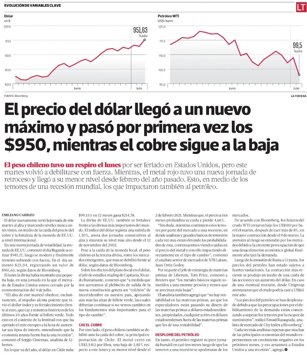 Dólar escala hasta $951 y el peso es la segunda moneda latinoamericana más depreciada en el año - (Diario Financiero)