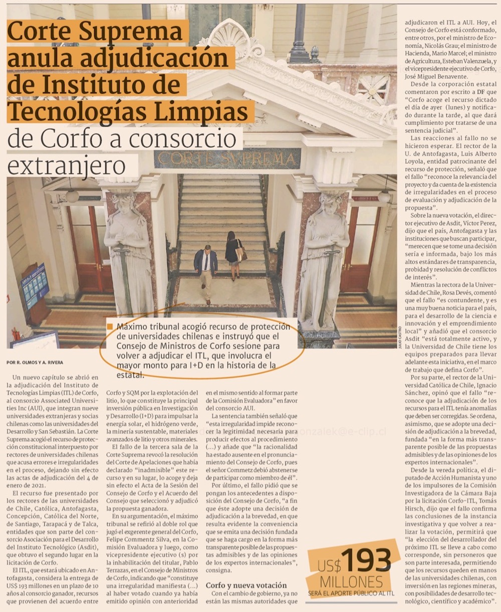 Corte Suprema anula adjudicación del Instituto de Tecnologías Limpias - (El Mercurio de Santiago)