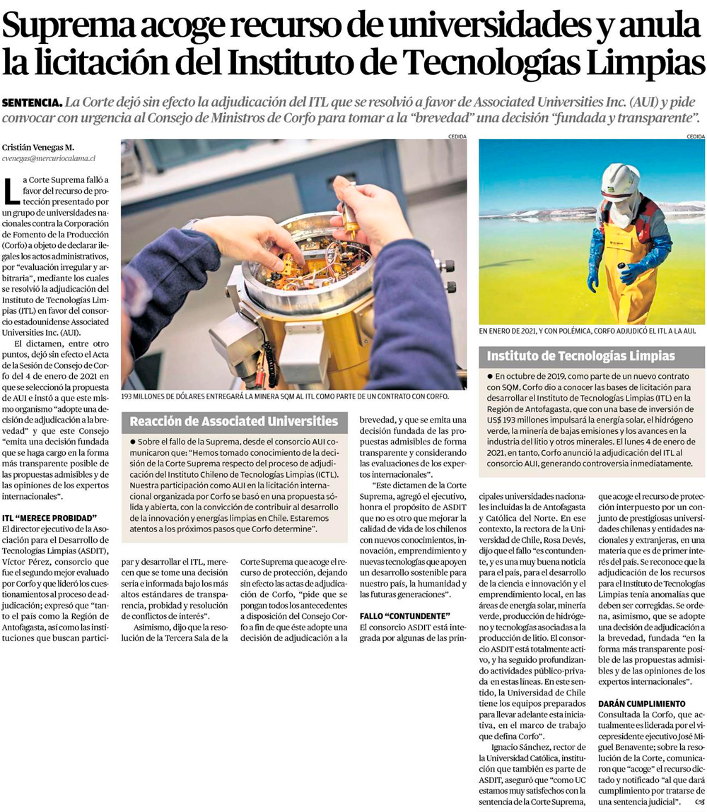 Corte Suprema anula adjudicación del Instituto de Tecnologías Limpias - (El Mercurio de Santiago)