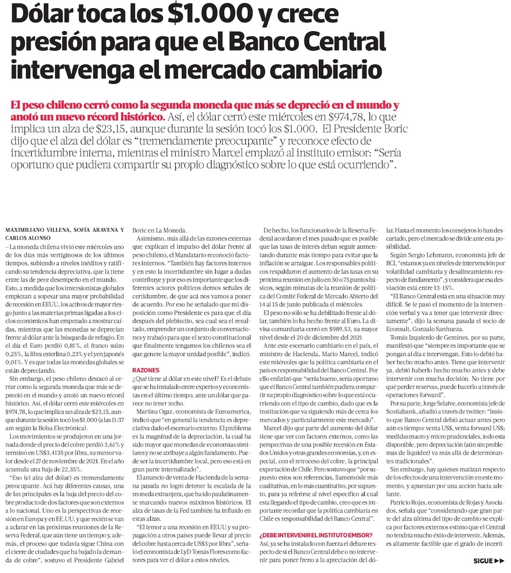 Dólar en Chile roza los $1.000: ¿Cuál es la próxima barrera técnica que ve el mercado? - (Diario Financiero)