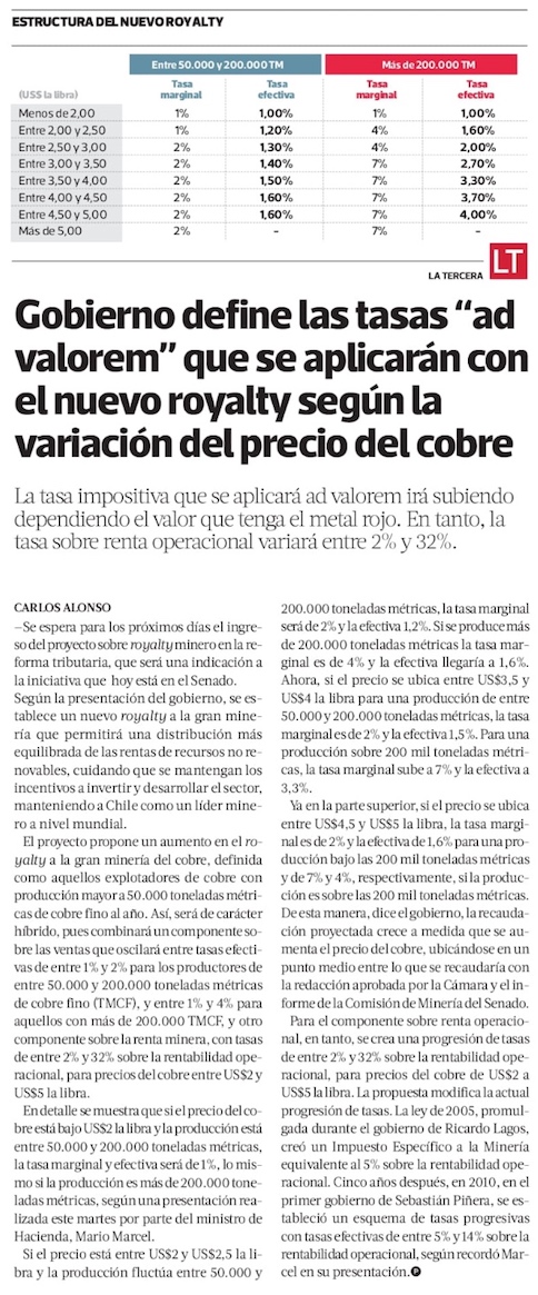 Carga tributaria de Chile con royalty superará a la de Perú si precio del cobre sube de US$ 3,7 la libra - (El Mercurio de Santiago)
