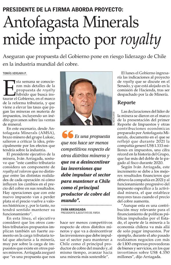 Minera del grupo Luksic advierte que reforma tributaria va a desincentivar las inversiones para que Chile siga siendo el mayor productor mundial de cobre - (Pulso Online)