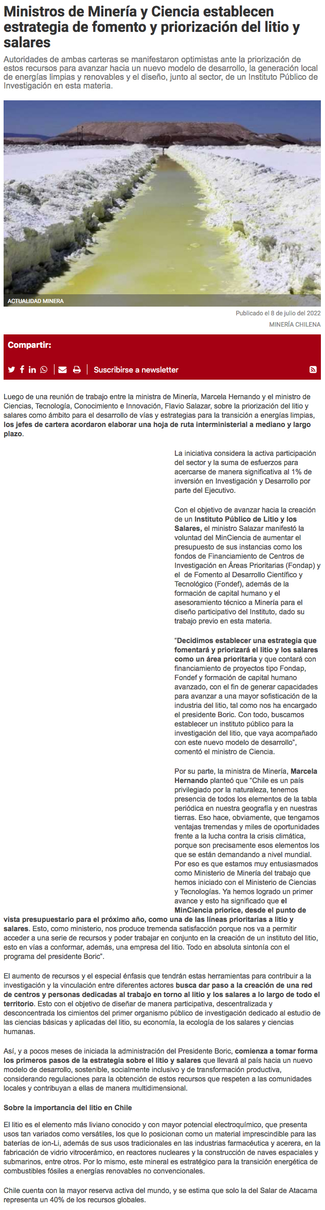 Gobierno establece una nueva estrategia de fomento y priorización del litio y salares - (El Mercurio de Antofagasta)