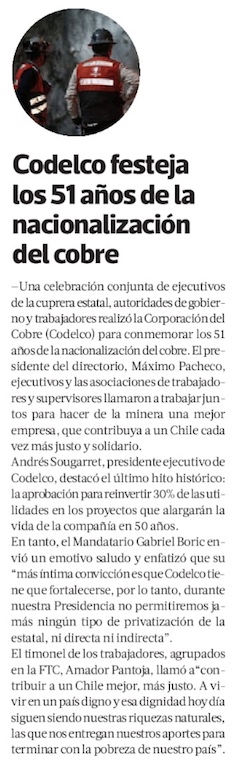 Codelco conmemora los 51 años de la "Nacionalización del Cobre" en Chile - (El Mercurio de Calama)