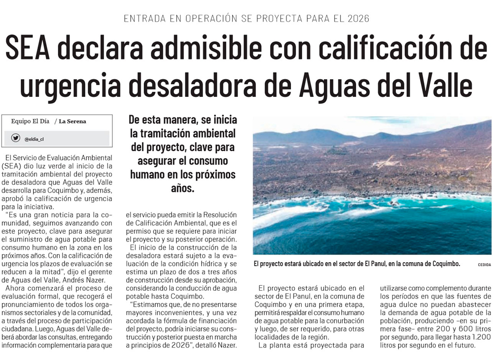 SEA: Admite con urgencia proyecto de desaladora en El Panul - (La Región)