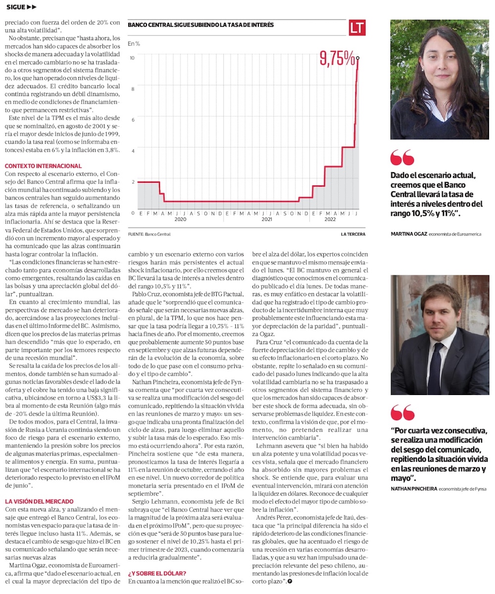 Banco Central sube la tasa de 9% a 9,75% y anticipa más alzas para controlar la inflación - (El Mercurio de Santiago)