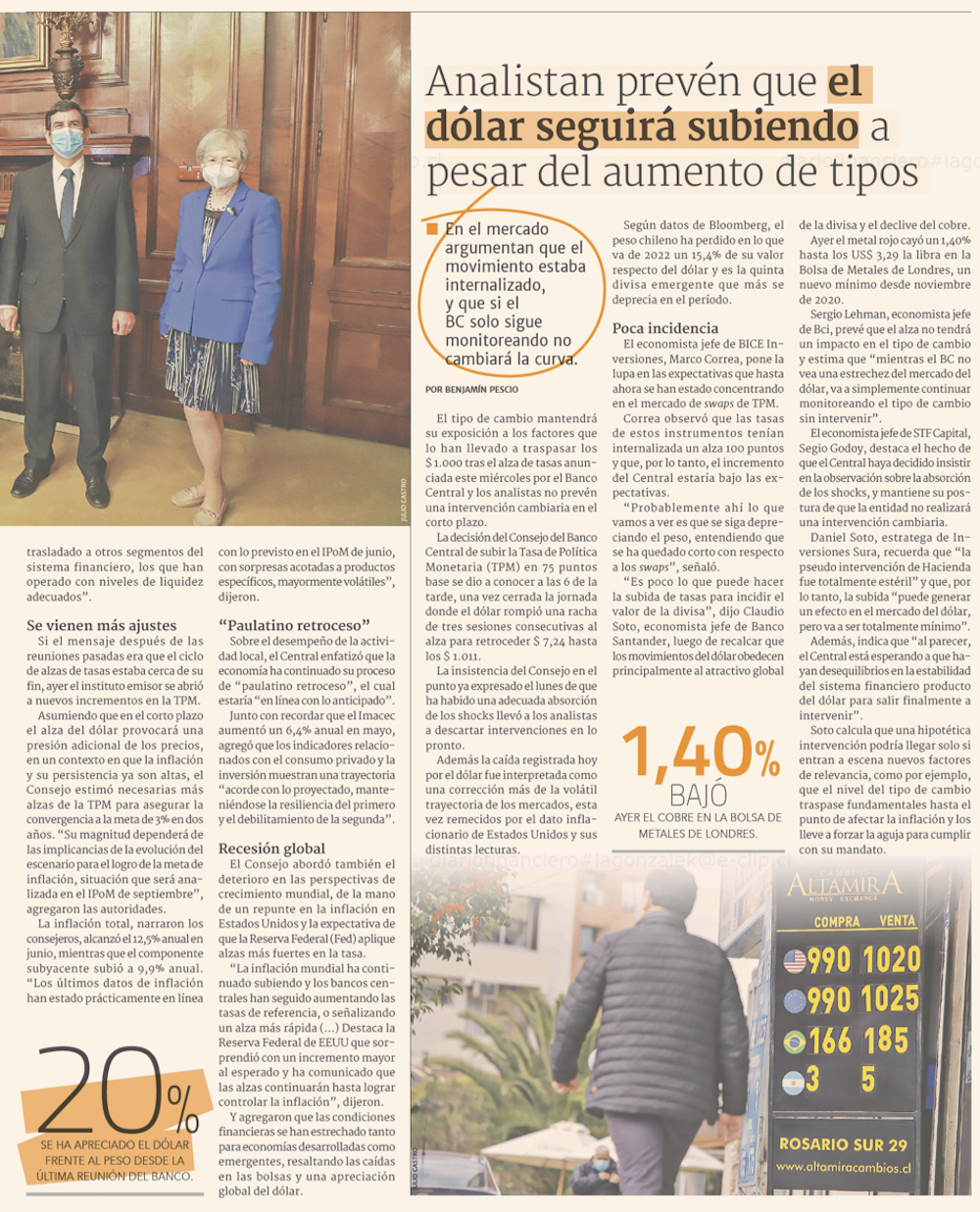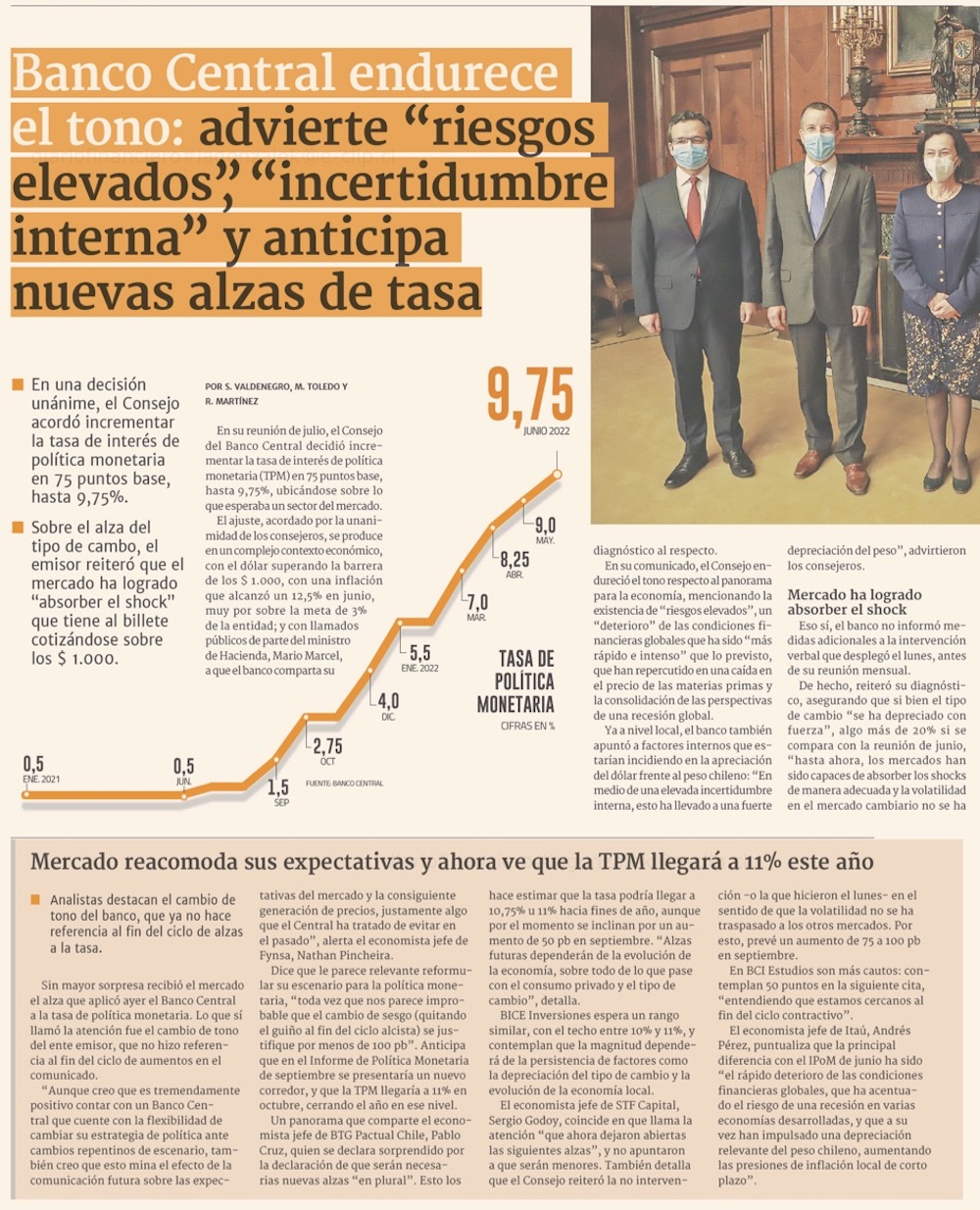 Banco Central sube la tasa de 9% a 9,75% y anticipa más alzas para controlar la inflación - (El Mercurio de Santiago)