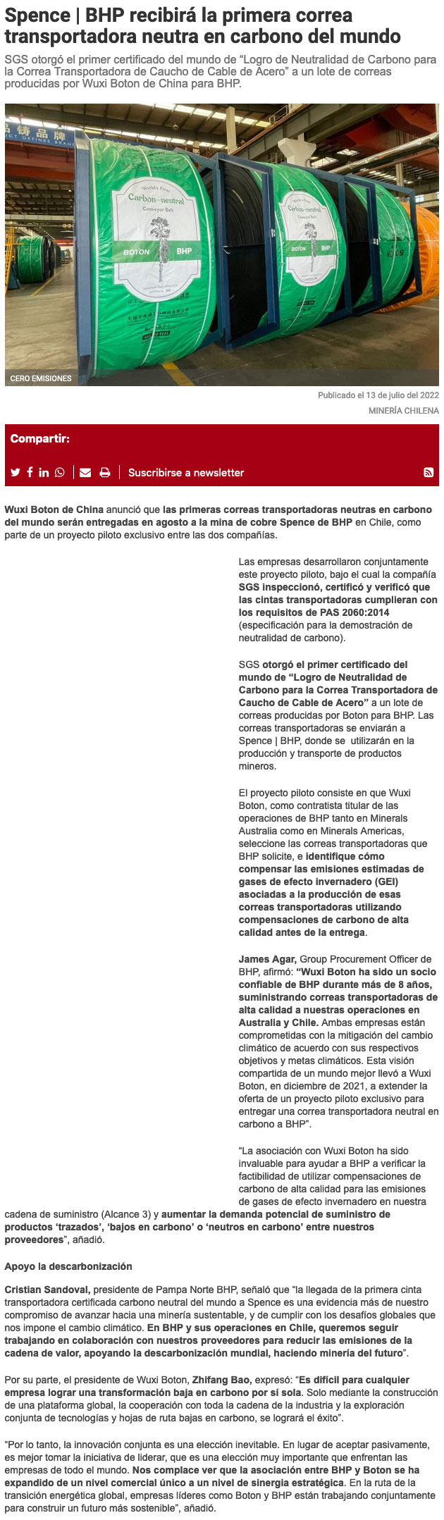 La primera correa transportadora neutra en carbono del mundo estará en minera Spence - (El Mercurio de Antofagasta)