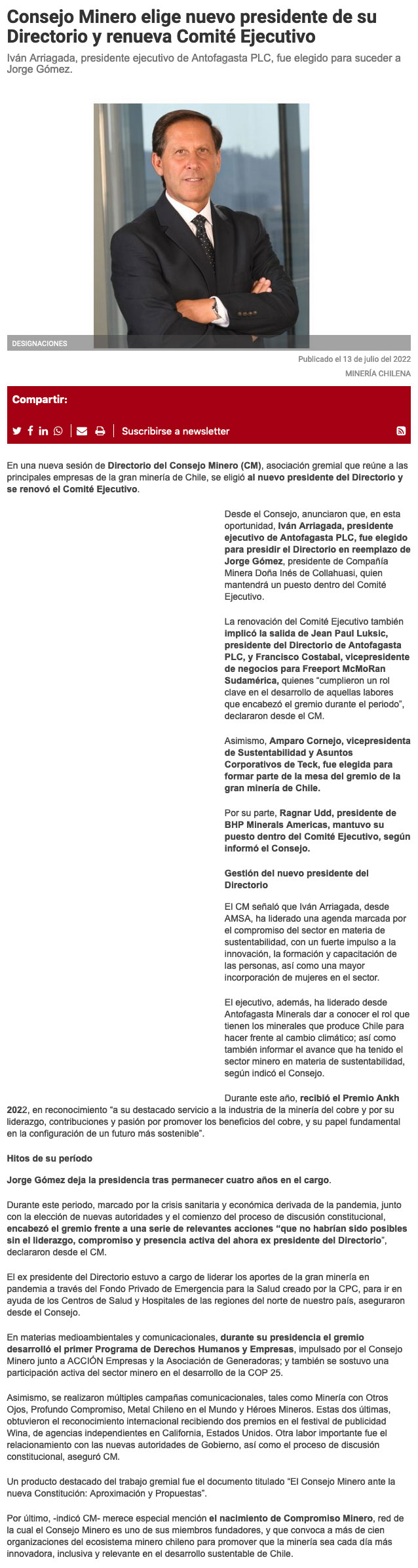 Iván Arriagada presidirá directorio del Consejo Minero, que agrupa a las 15 principales mineras del país - (norteminero online)