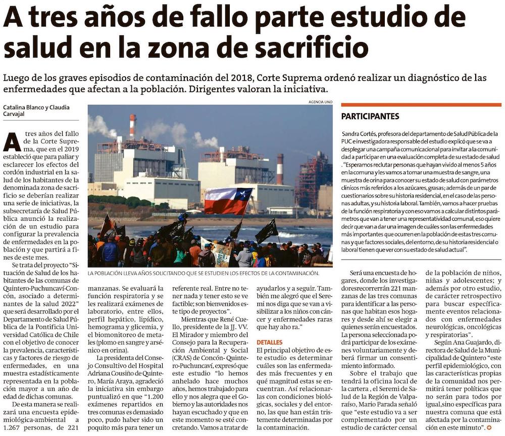 Con un año de plazo Gobierno inicia estudio para conocer efectos de la contaminación en habitantes de Concón, Quintero y Puchuncaví - (La Tercera)