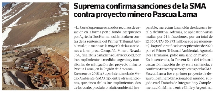 Corte Suprema confirma clausura en contra de Pascua Lama - (El Mercurio de Santiago)