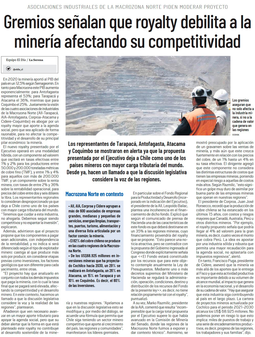 Industriales aseguran que royalty minero afecta la competitividad y cadena de valor - (El Mercurio de Antofagasta)