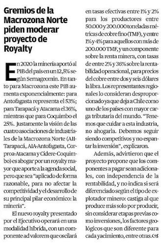 Industriales aseguran que royalty minero afecta la competitividad y cadena de valor - (El Mercurio de Antofagasta)