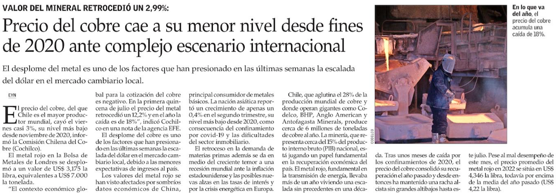 El cobre ha perdido 27% más de de su valor en el año: ¿qué factores están arrastrando al metal rojo? - (Diario Financiero)
