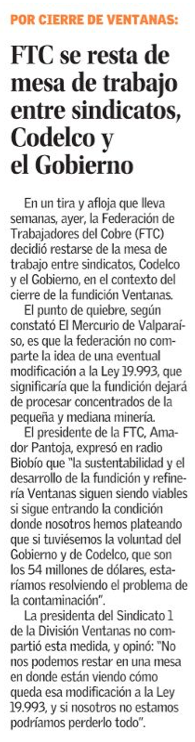 Quiebre entre Sindicato Ventanas y la FTC por negociación con Codelco - (El Mercurio de Valparaíso)