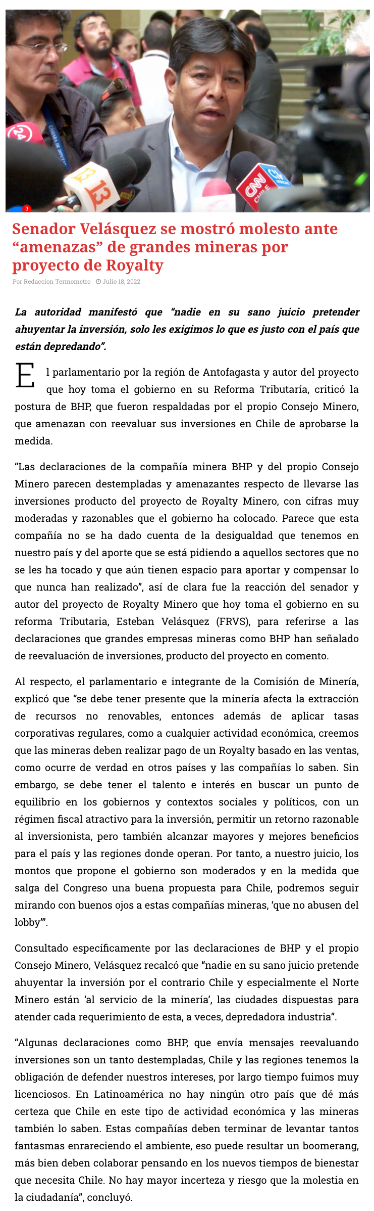 Senador Velásquez acusa “amenazas” de BHP por royalty: “Nadie en su sano juicio pretende ahuyentar la inversión, solo les exigimos lo que es justo” - (diarioantofagasta)