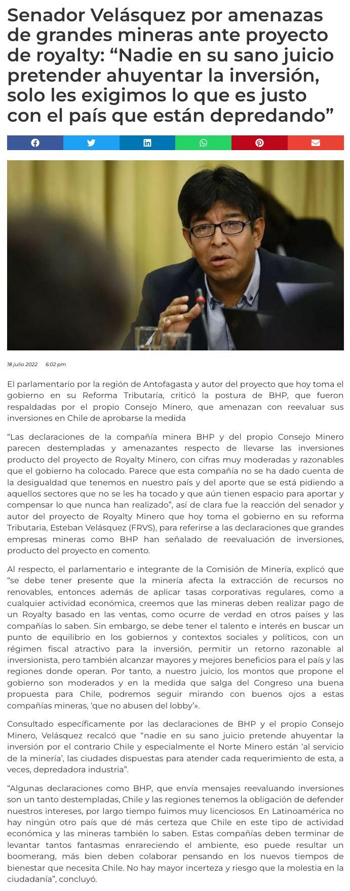 Senador Velásquez acusa “amenazas” de BHP por royalty: “Nadie en su sano juicio pretende ahuyentar la inversión, solo les exigimos lo que es justo” - (diarioantofagasta)
