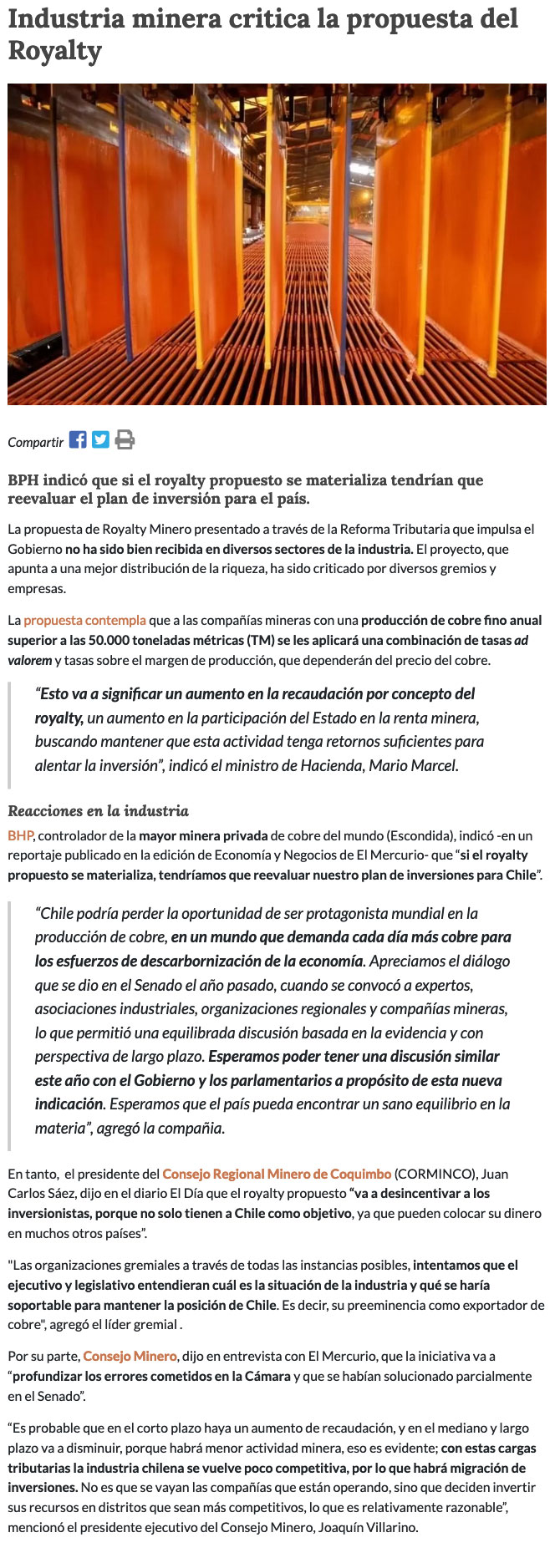 Propuesta de Royalty desata críticas entre compañías mineras y expertos del sector; advierten diversos perjuicios para la actividad y el país - (mineriayfuturo.cl)