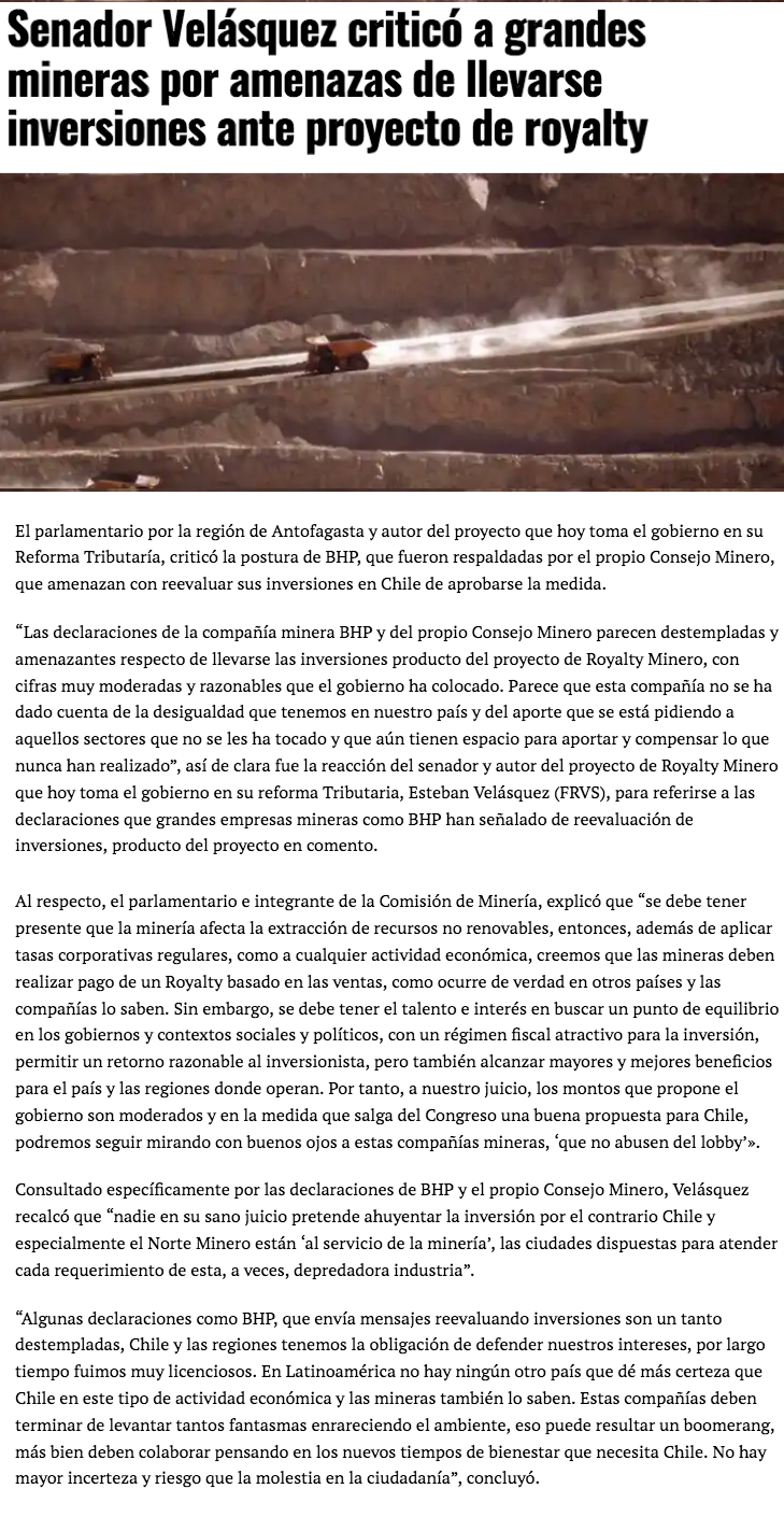 Senador Velásquez acusa “amenazas” de BHP por royalty: “Nadie en su sano juicio pretende ahuyentar la inversión, solo les exigimos lo que es justo” - (diarioantofagasta)