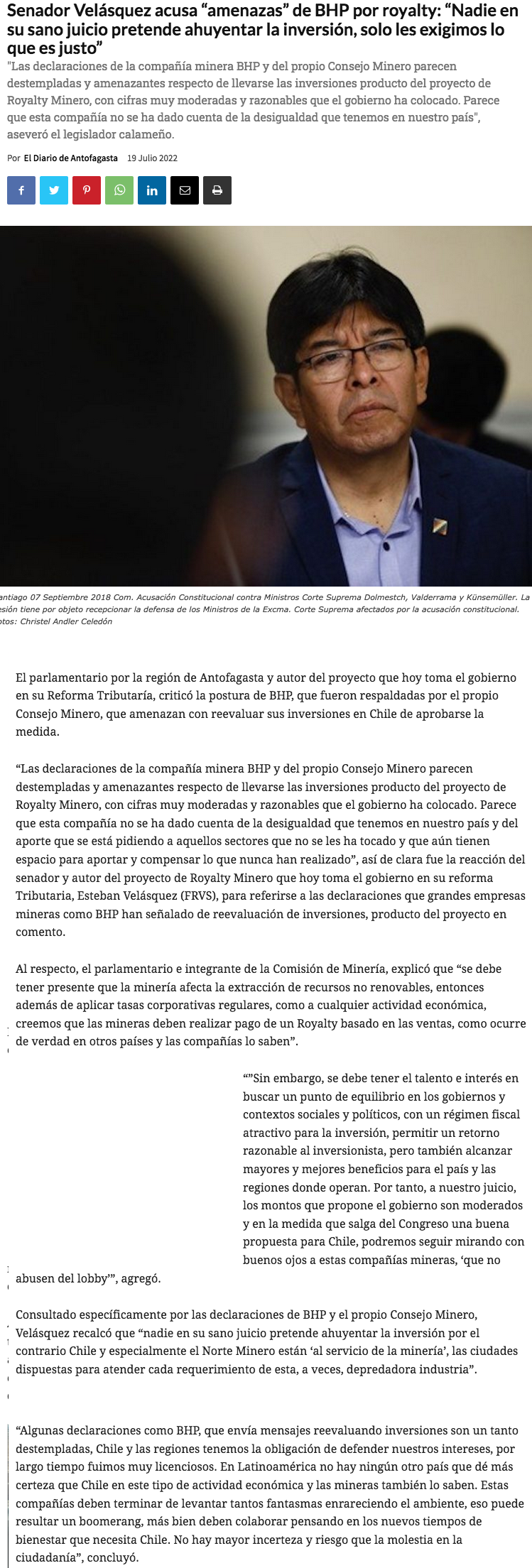 “Nadie en su sano juicio pretender ahuyentar la inversión, solo les exigimos lo que es justo con el país que están depredando” - (g5noticias.cl)