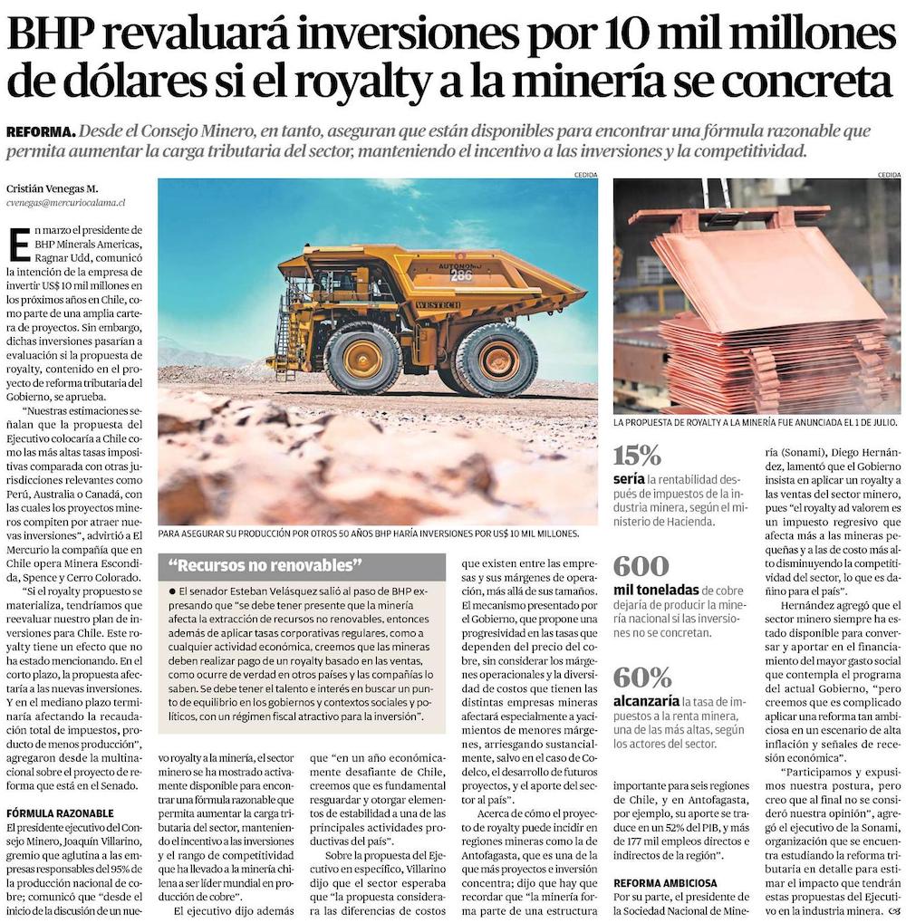 BHP revaluará inversiones por 10 mil millones de dólares si el royalty a la minería se concreta - (El Mercurio de Calama)