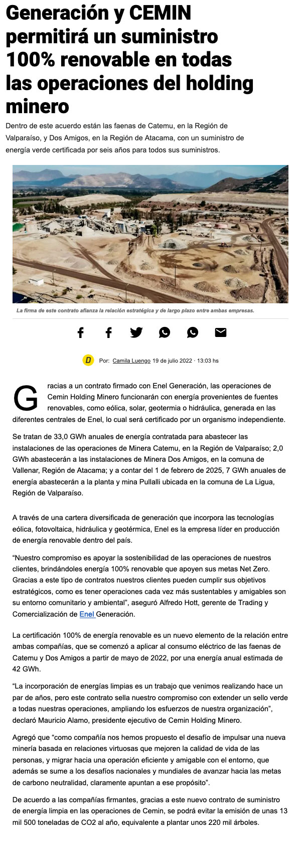 Cemin Holding Minero tendrá suministro 100% renovable gracias a contrato con Enel Generación - (revistaei.cl)
